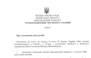 У Белзькій міській територіальній громаді оголошено Дні жалоби.З 6 по 8 лютого 2026 року в Белзькій громаді триватимуть Дні жалоби у зв'язку з похованням...