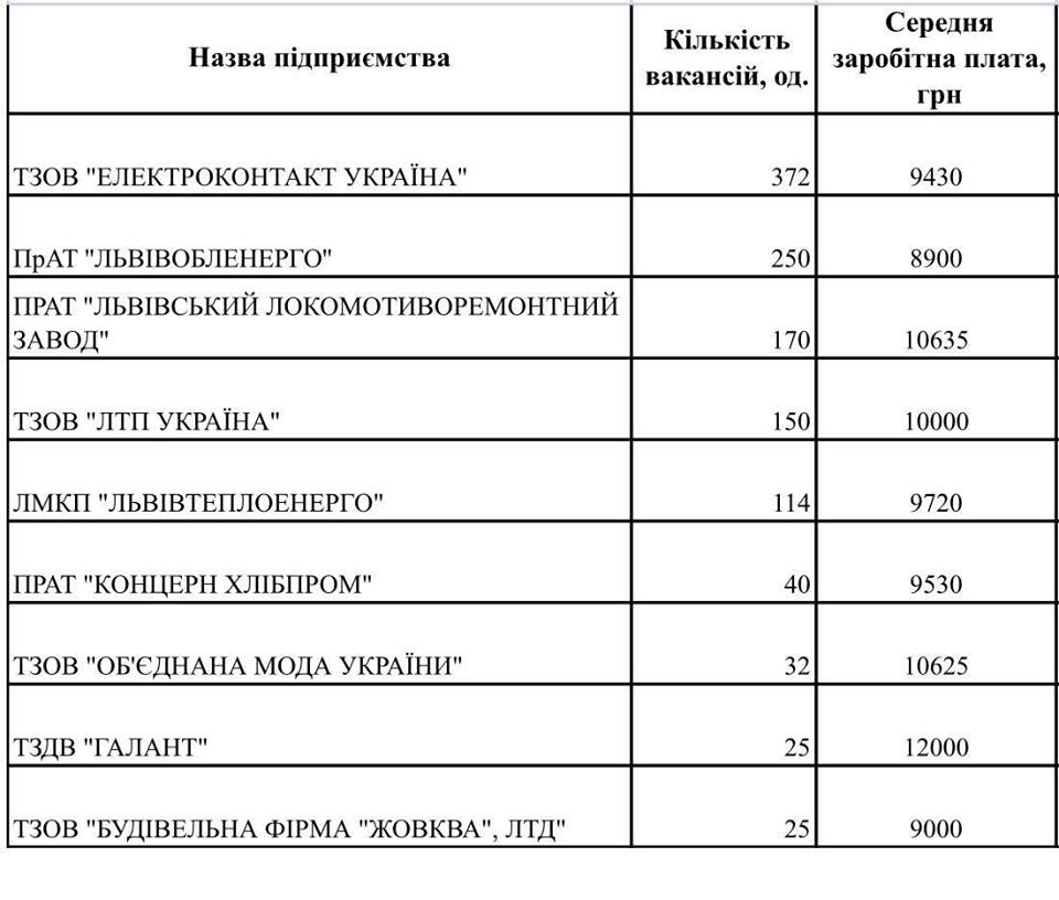Як аргумент наводиться таблиця з вакансіями на підприємствах Львівщини :