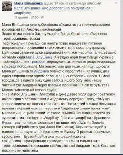 «Згідно вимог нового Закону України "Про добровільне об'єднання територіальних громад" територіальні громади сіл мають право вирішувати питання добровільного об'єднання в об'єднану територіальну громаду. Цей новий закон не дуже відпрацьований, має недоліки, але дає шанс жителям села Мала Вільшанка, які згідно норм Конституції України є Територіальною Громада вирішувати це питання (якщо Андріївська сільрада погодиться). Ми знаємо, але для інших напишу, що села Мала Вільшанка та Андріївка повністю переплутані. Є вулиці, де з одної сторони хати одного села, а з іншої сторони – іншого. Є межі городів, де з одного боку одне село, з іншого боку межі – інше. Частина хат Андріївки через взаємне проникнення сіл беруть газ з Маловільшанецької газової труби.