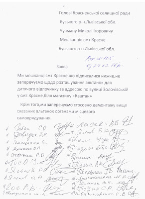 Все розпочалось з того, що виконком селищної ради, до складу якого входять голова селищної ради Микола Чучман, секретар ради Ольга Мельник, настоятель храму св.Володимира Великого (УАПЦ) Юрій Толочний, лікар-хірург Буської ЦРЛ, мешканка селища Світлана Лаврін, директор Красненської ЗОШ I-IIIст. №1 Ірина Чиж та приватний підприємець Михайло Котула, на основі скарг кількох мешканців прилеглої території, скарги дирекції ЗОШ №1 та акту від 22.02.2016р. про обстеження озелененої території в смт.Красне по вул. Золочівській біля магазину «Каштан» (власник магазину Захаревич О.Є.), виконком селищної ради прийняв рішення, щоб приватний підприємець Захаревич Ольга Євгенівна прибрати самостійно встановлені три альтанки на прилеглій території, у випадку якщо у 10-денний термін підприємець не дотримується зобов’язання, селищна рада самостійно демонтує альтанки. Як стверджує підприємець, він немає відношення до альтанок, їх встановила самостійно громада селища за власні кошти.