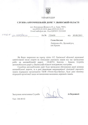 Відтак Богдан Глова спочатку написав листа начальнику Служби автомобільних доріг у Львівській області Лазаренку Ю.В та голові Львівської ОДА Синютці О.М. з проханням відновити демонтовані знаки зупинок для пасажирського автотранспорту, а згодом зателефонував на «гарячу лінію області» і повідомив про проблему. І хоча відповіді на листа ще досі немає, проте надійшла відповідь від Служби автомобільних доріг після звернення на лінію «Служби 112». Подаємо її дослівно: