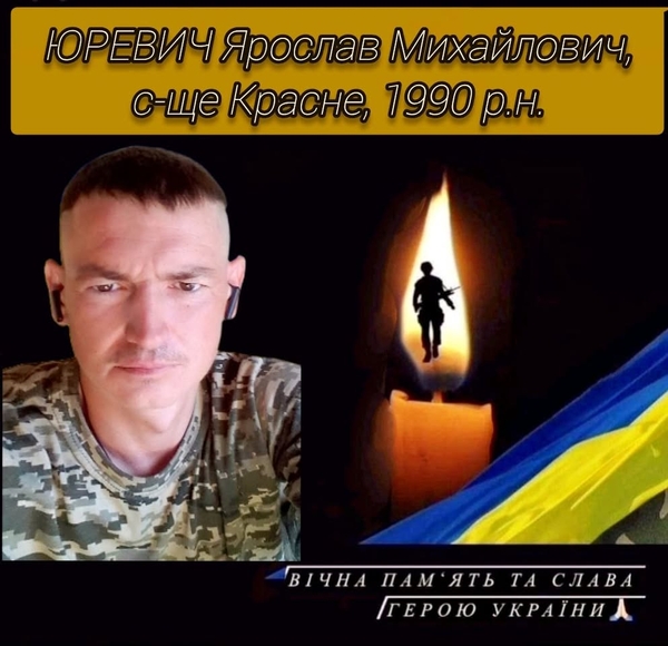 З глибоким сумом повідомляємо про непоправну втрату. У боротьбі за незалежність України загинув наш земляк, солдат Юревич Ярослав Михайлович, 1990 року народження, мешканець селища Красне.