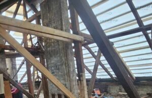 У будинку на вул. Олени Степанівни, 48, який постраждав від обстрілу росії, монтують металеве покриття даху.У Львові триває відновлення житлових будинків, які постраждали від...