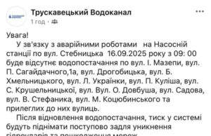 У місті Буськ 16 вересня 2025 року буде тимчасово припинено водопостачання.Буське ПВКГ повідомляє, що у вівторок, з 09:00 до 15:30, водопостачання буде відсутнє через...