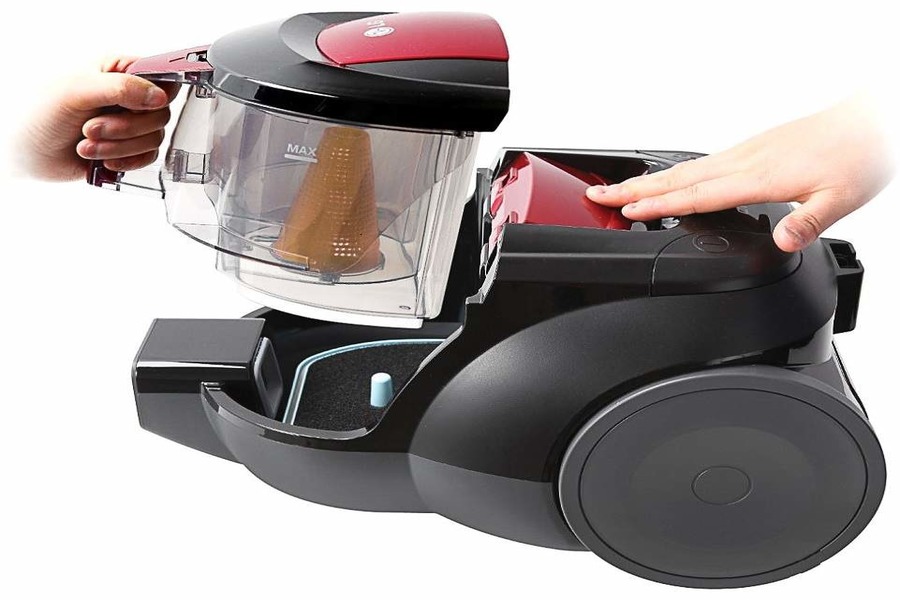 Все пылесосы, оснащенные контейнерами для пыли, функционируют по принципу циклона, то есть движение всасываемого воздуха происходит вихревыми потоками по спирали. Благодаря действию центробежной силы, пылевые частички и мусор оседает на стенках контейнера. После уборки нужно просто вытащить его, очистить от загрязнений и сполоснуть водой.