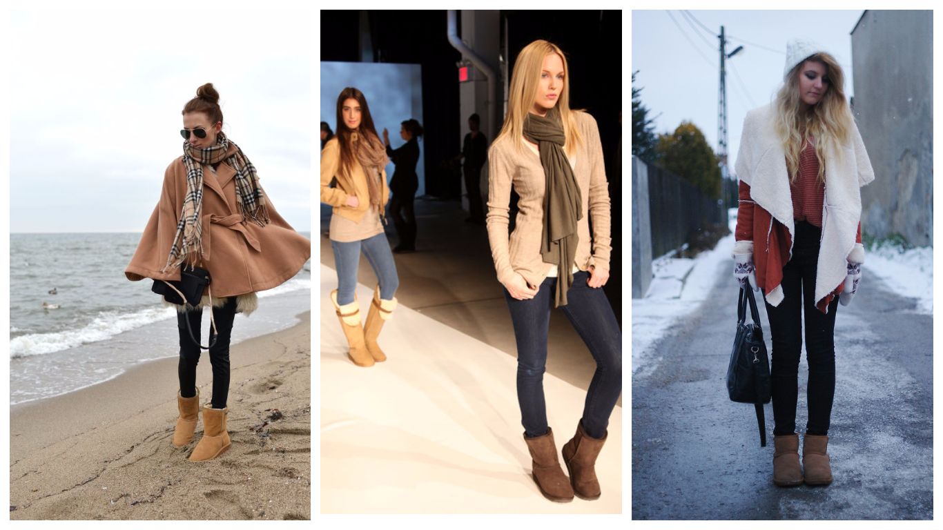 Сегодня угги носят почти круглогодично — даже есть летние модели. Идеальным вариантом является сочетание обуви с узкими джинсами-скинни. Для верха подойдет свитер, свитшот или кардиган. Верхнюю одежду нужно выбирать из укороченных моделей, например классическое кашемировое пальто длиной до середины бедра. Шапка простая, без меха и дополнительных украшений. Обогатить образ поможет шарф, объемная сумка и перчатки. Такой look считается наиболее выигрышным. Другие возможные варианты для разных сезонов.