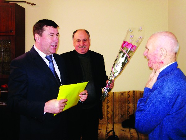В октябре этом энергичном мужчине исполнится 90 лет. Но мы решили не ждать юбилейной даты, ведь на днях выпала прекрасная возможность пообщаться с Красненский долгожителем. Ему, как ветерану и инвалиду войны II группы, вручили ключи от новесенькои автомобиля "Сенс" (ЗАЗ). Вместе с главой Буского РГА Владимиром Саем, начальником управления труда и соцзащиты Василием Стецик (на снимке в центре) и Красненского поселковым головой Олегом Лотоцким мы пришли в дом Феодосия Герасима и его семьи и узнали немало интересного — о жизни, былые времена и … песни. Особенно об УПА, которые любит петь дедушка, хотя именно через них, запрещенных в сталинские времена, попал в тюрьму. Даже в свои 90 он вспоминает неизвестны широкой публике куплеты о славных борцов за волю Украины. А главное — он знает секрет долголетия, и радостно делится им.