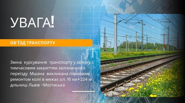 За інформацією Львівської РДА, регіональна філія «Львівська залізниця» проводить середній ремонт колії на переїзді 16км + 224м дільниці Львів-Мостиська (з.п. Мшана). «У звʼязку з цим, здійснюється об’їзд транспорту відповідно до тимчасової схеми закриття переїзду», — повідомляє Львівська РДА. Відновлення роботи переїзду планується 14 жовтня 2025 року, орієнтовно до 17:00. Просимо врахувати цю обставину, плануючи свої поїздки власним чи громадським транспортом.