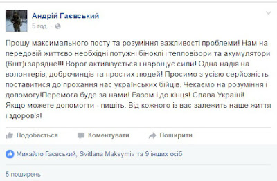 На странице соцсети «Фейсбук» военнослужащий Андрей Гаевский из Буска заявил, что сейчас на передовой жизненно крайне необходимы мощные бинокли, тепловизоры и аккумуляторы с зарядным, ведь враг активизировался и начал наращивать сиди.