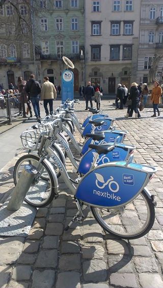 Немецкая компания NextBike Украины, при содействии Львовского городского совета, установила первые терминалы системы муниципального велопроката. К примеру, на пл. Рынок, терминал укомплектован несколькими велосипедами.