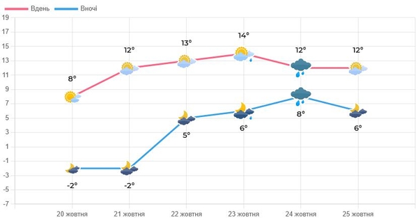 Циклон над Північним та Норвезьким морями зумовить невеликі дощі по області, лише 24 жовтня очікуються помірні опади. Вітер переважатиме південного напрямку, а в кінці тижня стане поривчастим. Температура повітря поступово зростатиме завдяки виносу теплої повітряної маси з південного заходу. Отже, 21 жовтня вночі очікується заморозок, а 22 жовтня температура підніметься до плюсових значень, вдень коливатиметься від 10 — 15° тепла до 13 — 18° тепла.