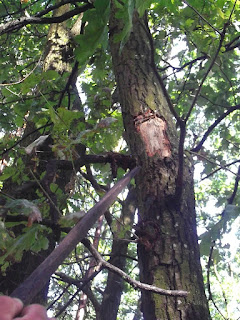 Мы приехали около 11:00 дня, возле шлагбаума заметили несанкционированный объезд, которым, очевидно, пользуются ловкие дельцы после завершения рабочего дня работников свалки. В доказательство слов: замечаем вверху свежие (!) Поломанные ветви деревьев и повреждения ствола дерева.