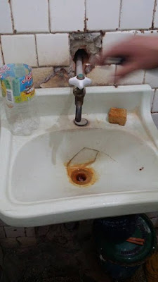 На кухне, что в соседнем помещении, из-за перебоев со светом недавно сгорел бойлер, поэтому горячей воды здесь нет. «В целом вода плохая, — жалуется повар. — Если вынуть фильтр, то на нем будет грубый налет рыжего цвета … ».