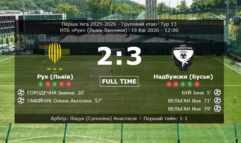 Жіночий футбольний клуб «Надбужжя» (м. Буськ) у неділю, 19 квітня, здобув виїзну перемогу над ЖФК «Рух» (Львів-Винники) з рахунком 3:2. Цей матч проходив у рамках XIII туру Чемпіонату України з футболу сезону 2025/2026 років серед жіночих команд Першої ліги (група А).